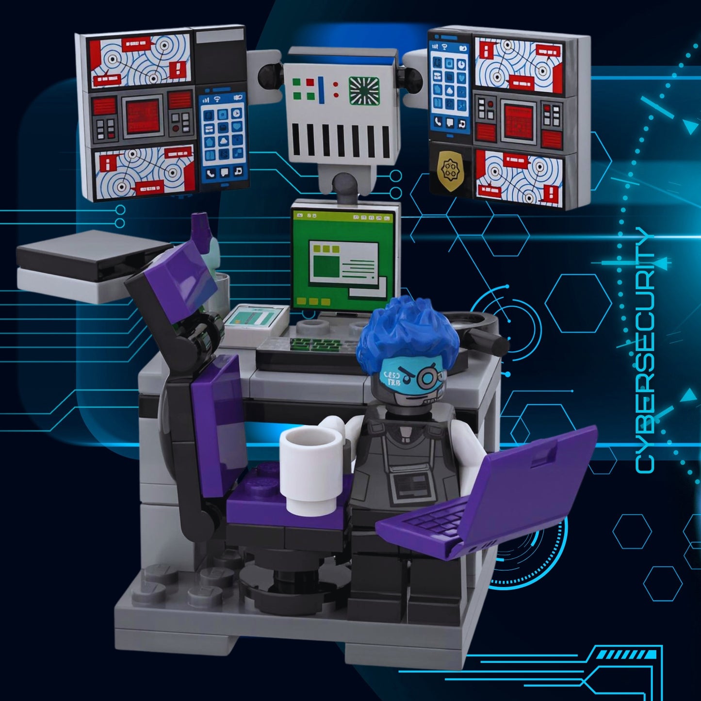 This custom LEGO® Cybersecurity Analyst Desk recreates a modern cyber defense workstation inspired by real-world security operations center (SOC) environments where analysts monitor networks and investigate digital threats.